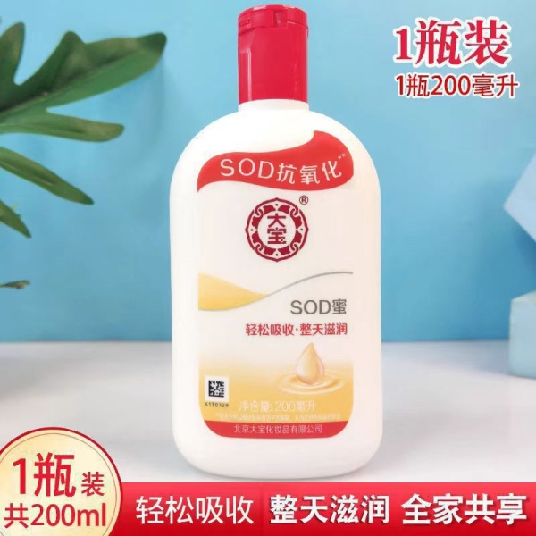 商品属性 [产品名称] SOD蜜100ml [产地] 杭州 [保质期] 3年 [化妆品功效] 补水保湿,晒后修护,柔润肌肤 [品牌类型] 国货品牌 [是否跨境出口专供货源] 否 [是否进口] 否 [特妆产品名称] 大宝100mlsod蜜 [特殊用途化妆品] 否 [生产许可证号] 京妆20160020 [适用人群] 通用 [适用肤质] 通用 [非特化妆品备案证号] 京G妆网备字2019005059