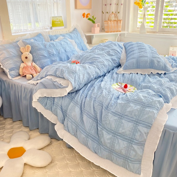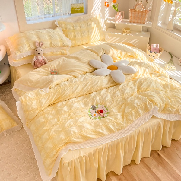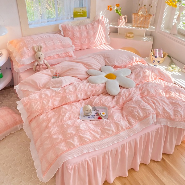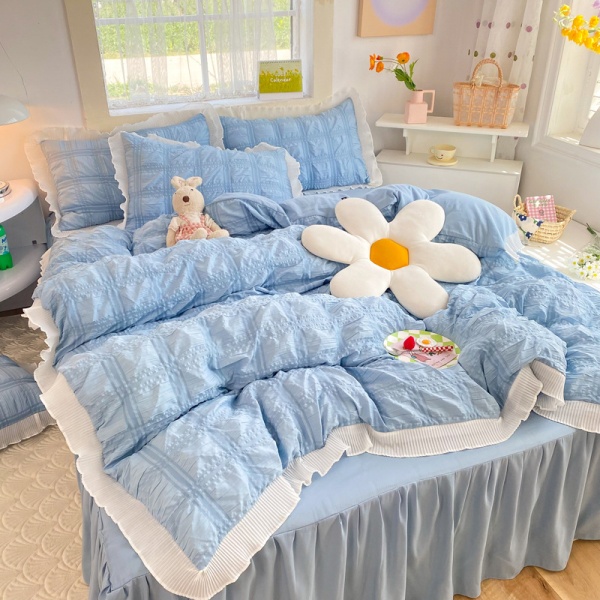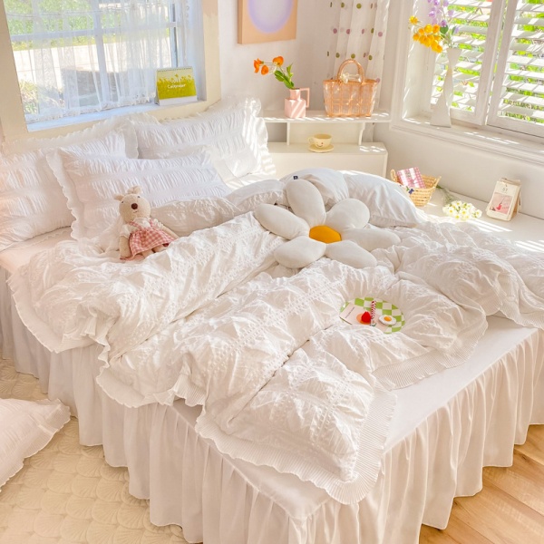 商品属性 [克重] 800g(含)~1000g(不含) [加工定制] 是 [印染工艺] 活性印染 [图案] 纯色 [是否一般纳税人] 是 [材质] 水洗棉 [款式] 床单式 [织造工艺] 水洗,褶皱 [风格] 公主风