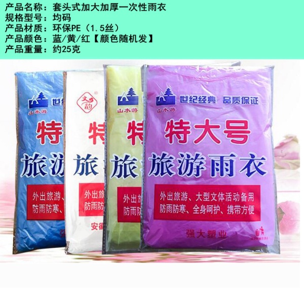 商品属性 [产地(国内)] 浙江省 [加印LOGO] 不可以 [加工定制] 否 [包装方式] 袋装 [是否一次性] 是 [是否专利货源] 否 [是否跨境出口专供货源] 否 [是否进口] 否 [款式] 连体雨衣 [适用人数] 1人 [适用对象] 成人 [防水胶层] 无 [雨具用途] 徒步雨披 [雨衣厚薄] 常规 [雨衣布料] PE膜 [风格] 现代简约