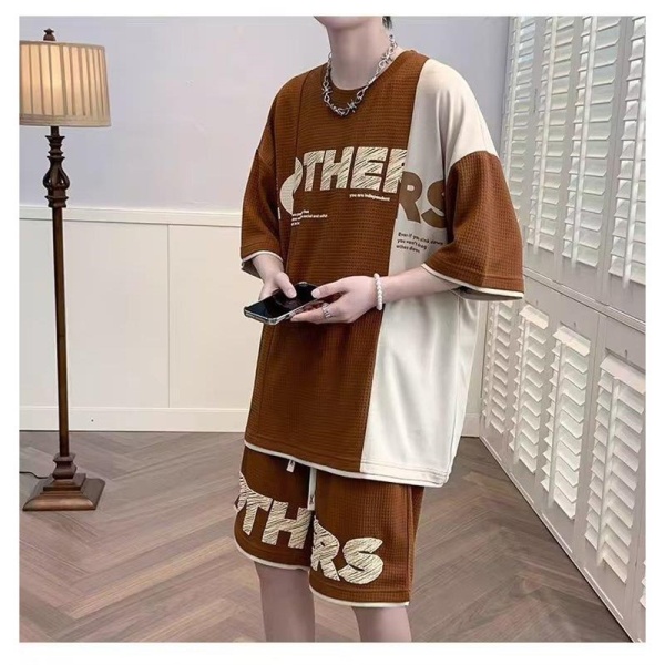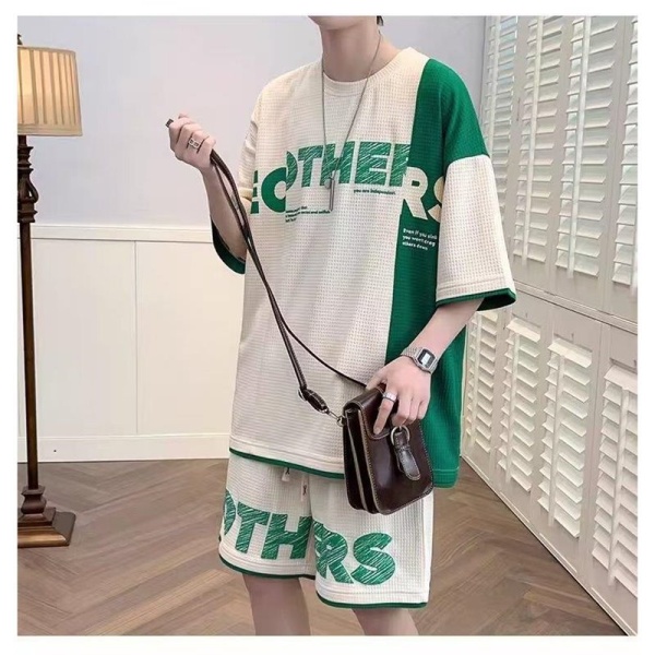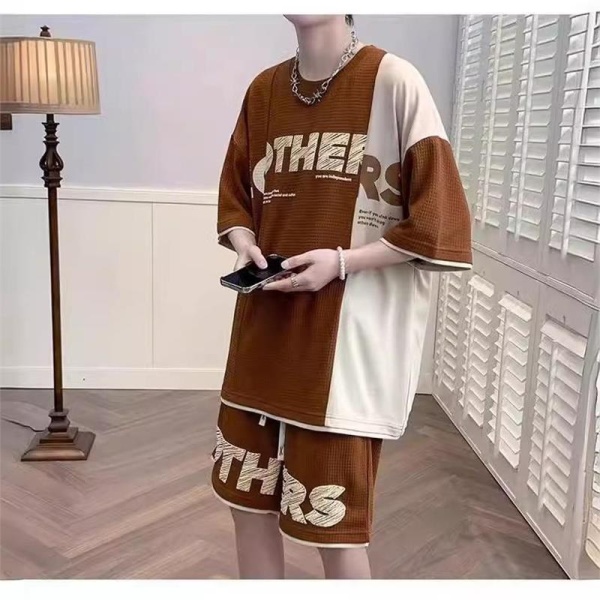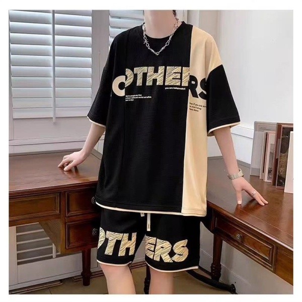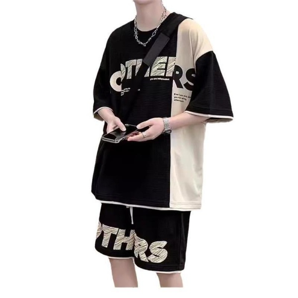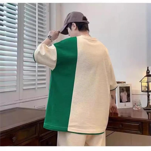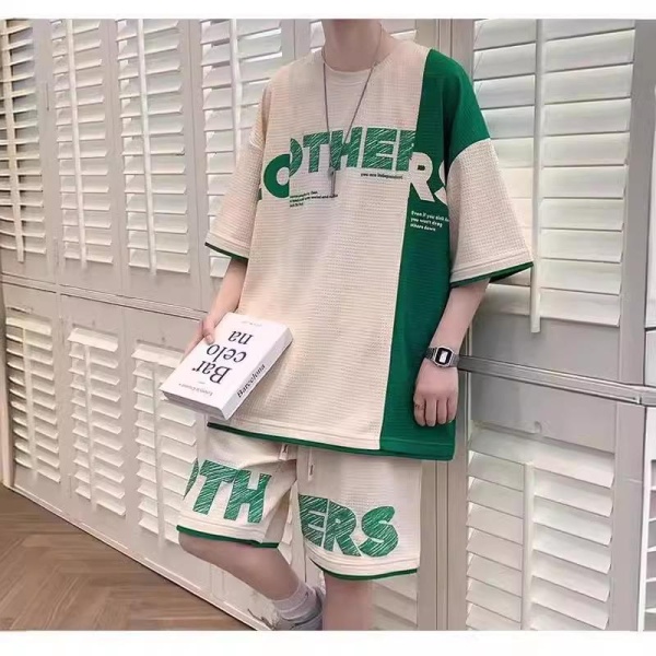 拼色华夫格休闲套装男士夏季宽松短袖短裤搭配帅气运动服男装一套