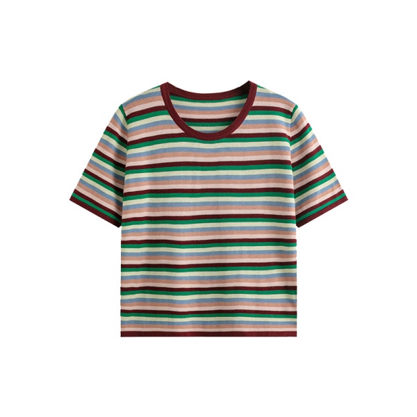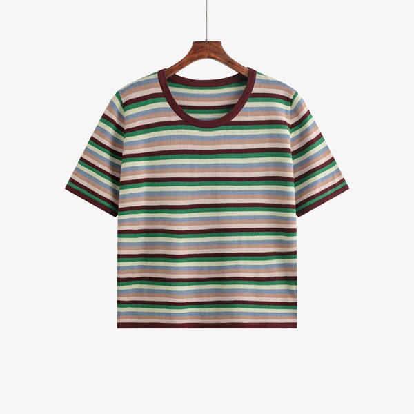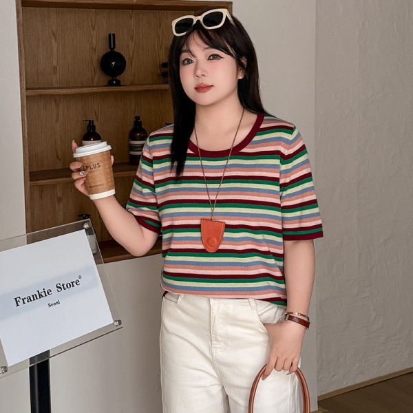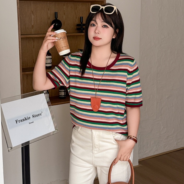 大码女装彩色条纹上衣女针织衫2025夏款胖mm宽松显瘦短袖t恤22837