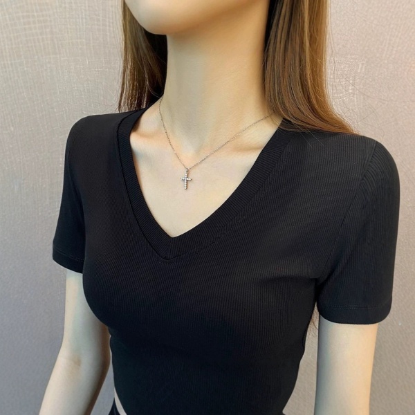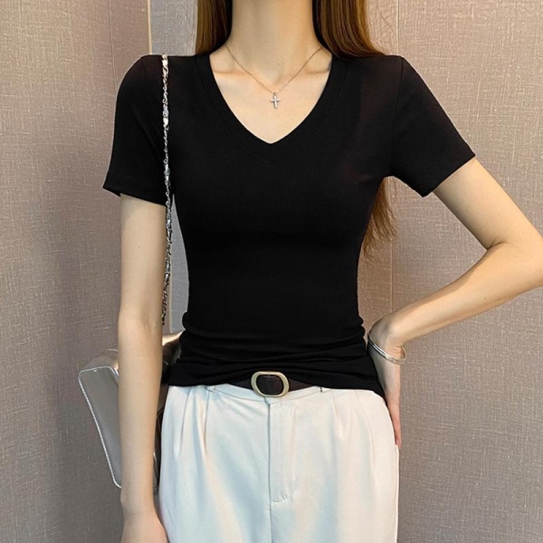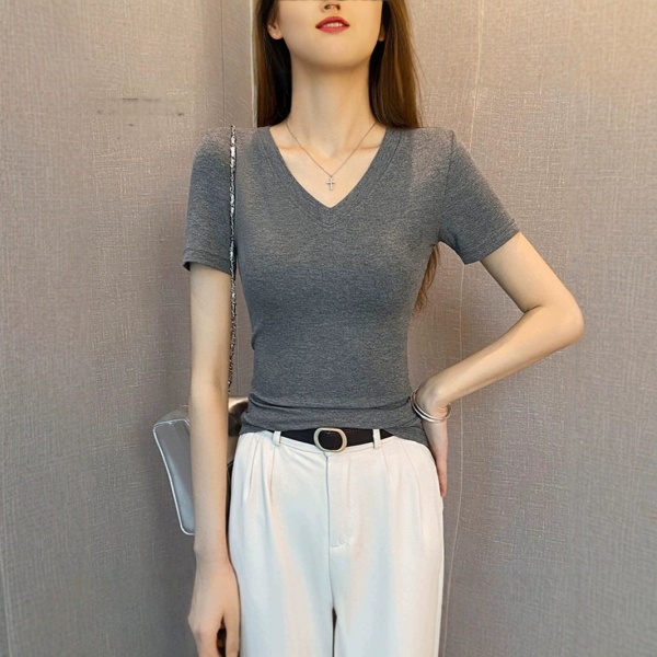 纯色螺纹V领短袖t恤女春夏2025年新款低领修身打底衫百搭显瘦上衣